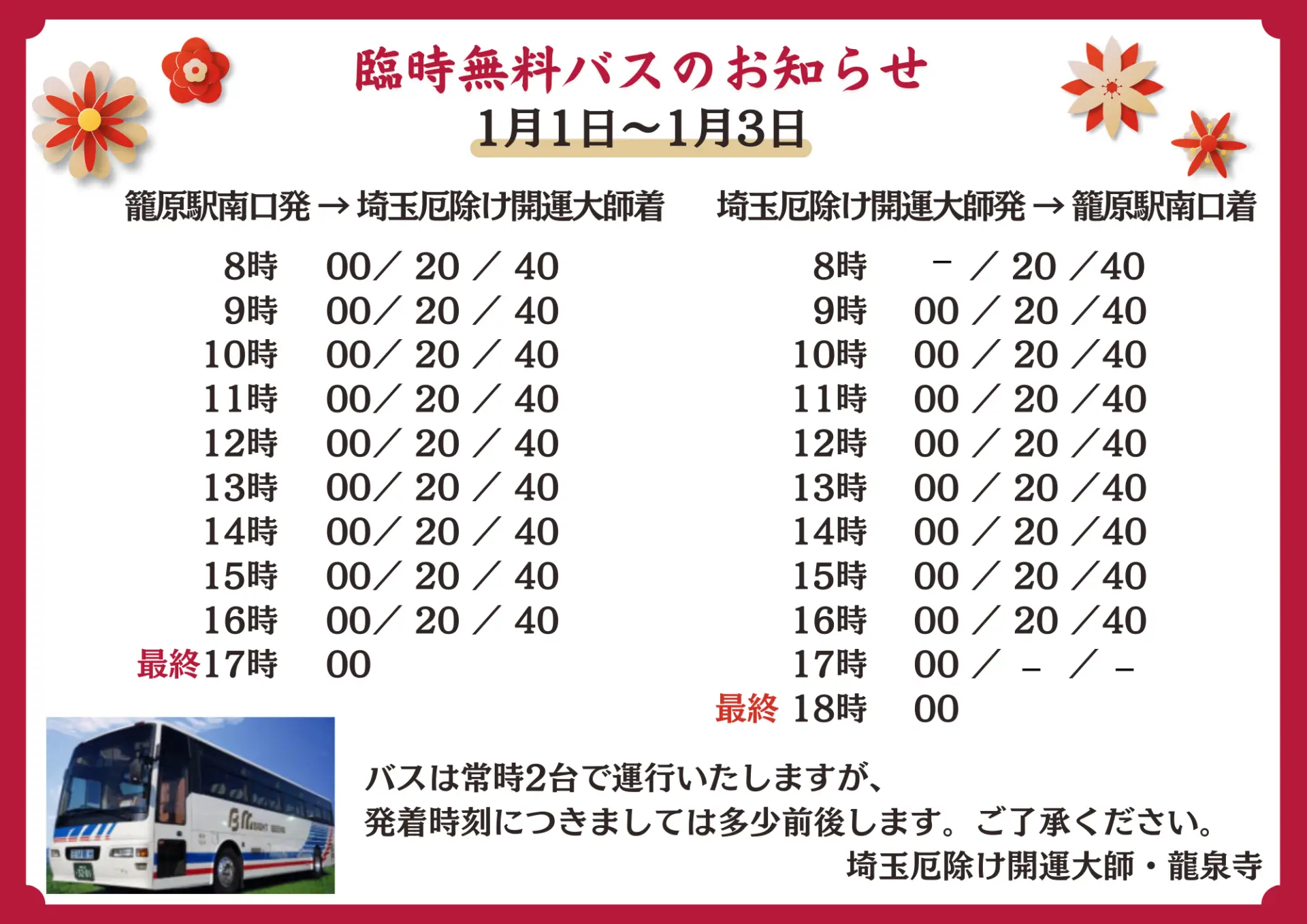 初詣大祈願祭期間中の1月1日~3日までJR籠原駅南口より無料臨時シャトルバスの運行がございます。