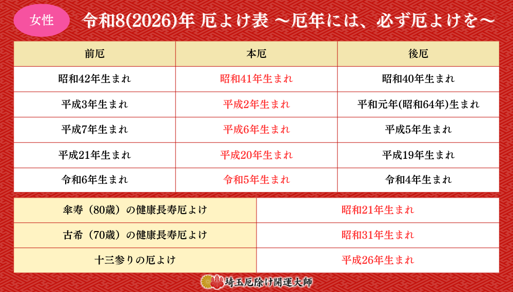 2026年に本厄を迎えるのは、昭和21年・昭和31年・昭和41年・平成2年・平成6年・平成20年・平成26年・令和5年生まれの方です。