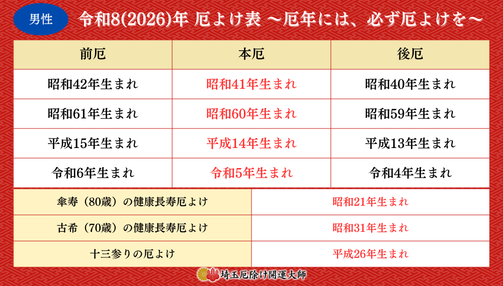 令和8年(2026年)の厄年に該当している方々は、以下の通りです。ご自身やご家族、周りの大切な方が厄年に該当しているかを確認しましょう。
