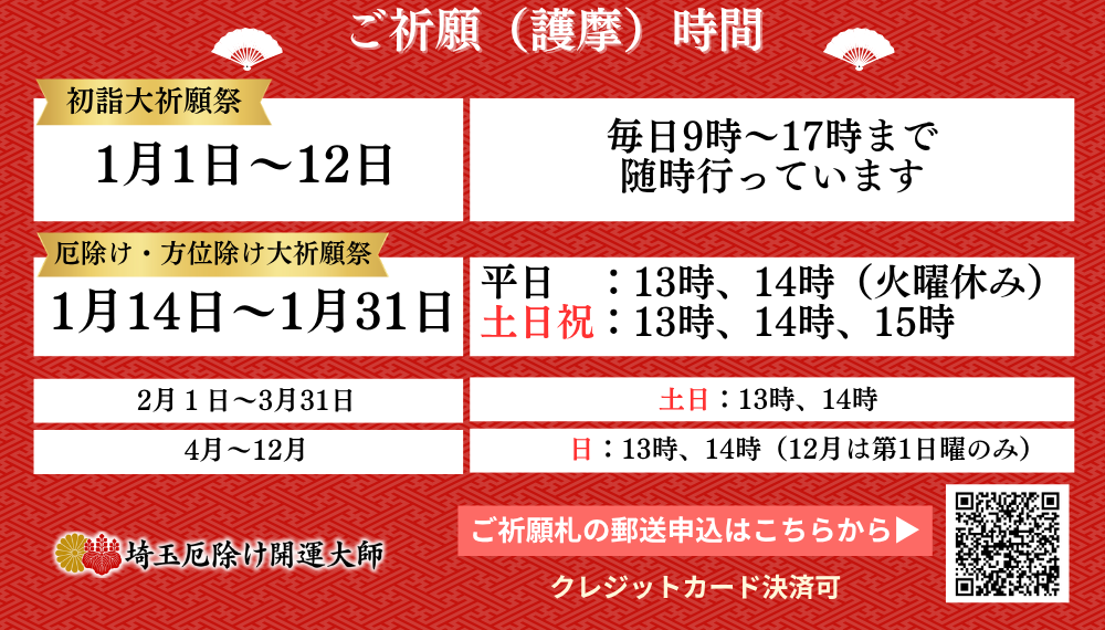 ◎厄除け・方位除け大祈願祭期間中は下記日時にて護摩祈願を厳修いたします。