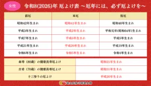 【10_18更新】2026年版女厄年早見表 - 埼玉厄除け開運大師 - 日本三大厄除け開運大師