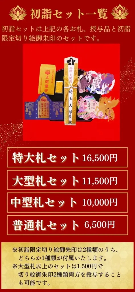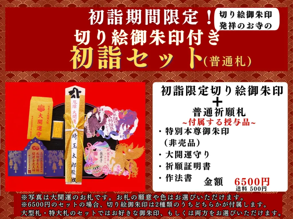 初詣セットで普通札をご注文いただいた場合、普通札と付属する授与品(特別本尊御朱印、大開運守り、祈願証明書、作法書)に加えて、切り絵御朱印発祥の寺、埼玉厄除け開運大師の初詣限定切り絵御朱印のうち、どちらか1枚をお送りいたします。(初詣セットの大型札・特大札をご注文いただいた場合、2種類両方をお選びいただくことも可能です。