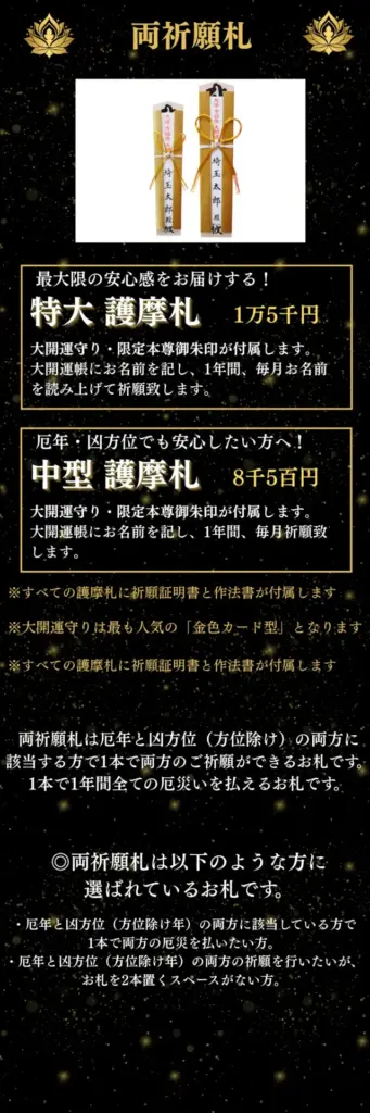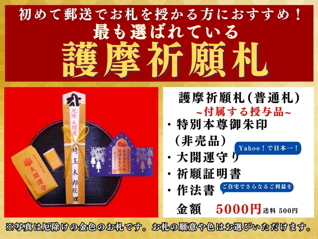 埼玉厄除け開運大師の護摩祈願札にはYahoo!で全国の最強開運お守り日本一に選ばれた大開運守り、特別本尊御朱印(非売品)も付属いたします。