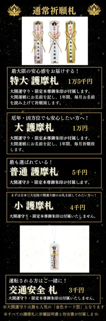 普通札をご注文いただくと、護摩祈願札に加えてお札を注文された方限定の特別本尊御朱印、大開運守り、祈願証明書、作法書が付属いたします。