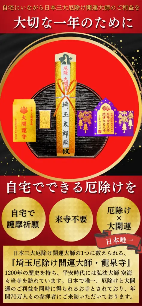 厄年や凶方位の年なので祈願を受けたいけれども、近くのお寺や神社はちゃんとご利益があるのかわからない、もしくは祈願を行っていないなどの理由で、厄除けや方位除けの祈願を受けようにも受けられないという方もいらっしゃると思います。