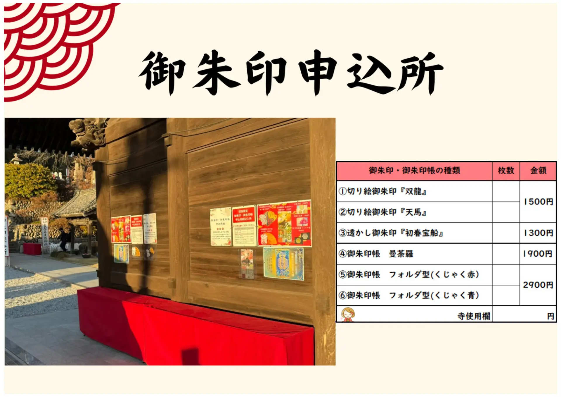 お並びの途中、仁王門横に御朱印申込書記入所がございますので、メニューを見ながら授与されたい御朱印の枚数や御朱印帳の冊数を申し込み用紙にご記入ください。