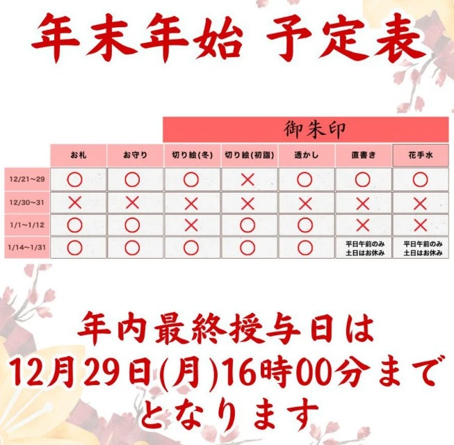 ※1月14日〜31日は、花手水御朱印と通常御朱印の直書きは平日午前のみとなります。