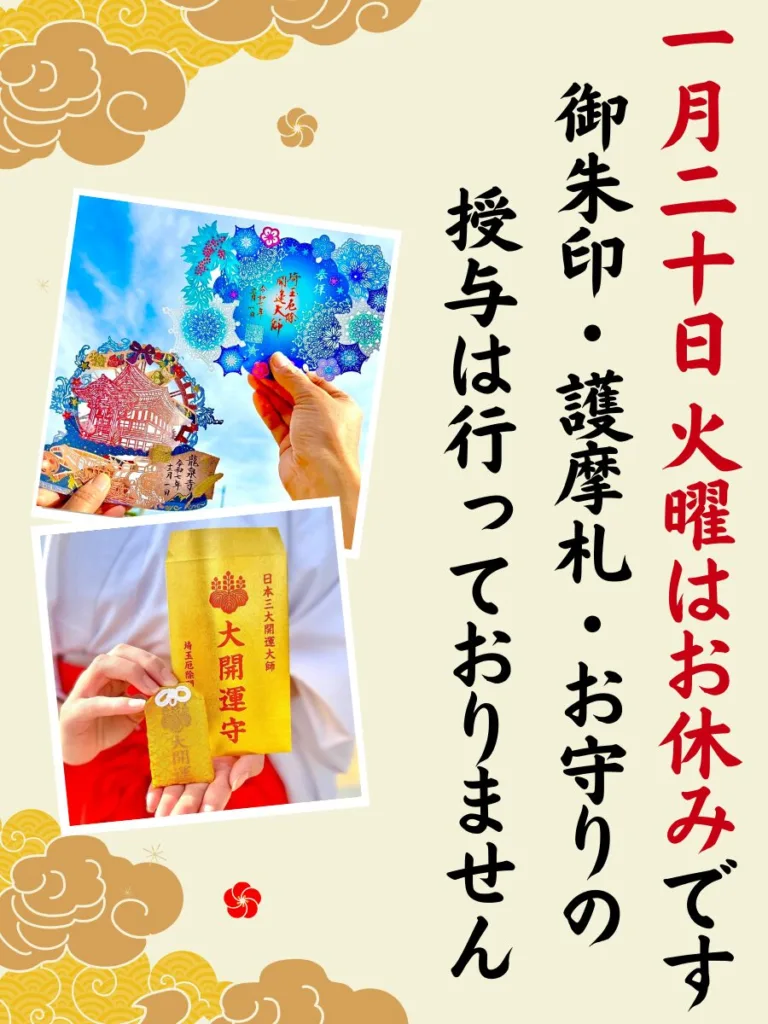 火曜日以外は、以下の通り護摩札・御朱印・お守りの授与を行っております。